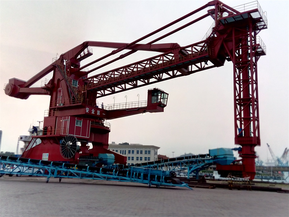 固定旋轉式:安裝在碼頭岸邊固定基礎上,依靠水平臂繞回轉塔旋轉與垂直取料器提取料。